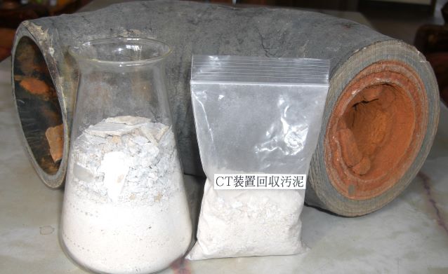 配管内のシリカ・スケール閉塞(茶色)と回収されたシリカ・スケール成分(白色)) |