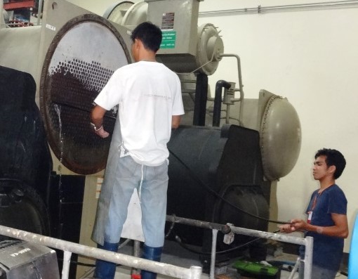 | 専任作業者による薬品注入による配管洗浄で復帰 (写真下部は薬品洗浄後) 黒い部分は、熱交換器 内の配管口 |