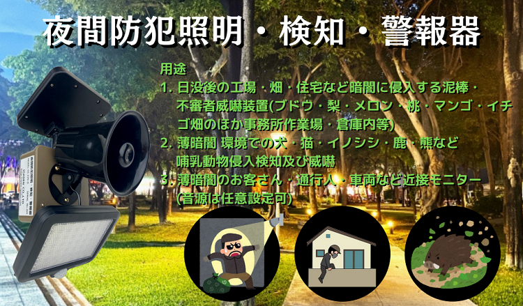- 日没後の工場・畑・住宅など暗闇に侵入する泥棒・不審者威嚇装置。(ブドウ・梨・メロン・桃・マンゴ・イチゴ畑のほか事務所作業場・倉庫内等)